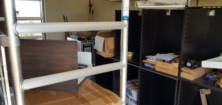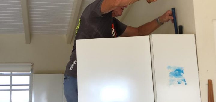 Pre-installeren Ikea keukenkastje met KOAK frontjes. Dat doe ik beneden in de garage met de rolsteiger als grote werktafel.