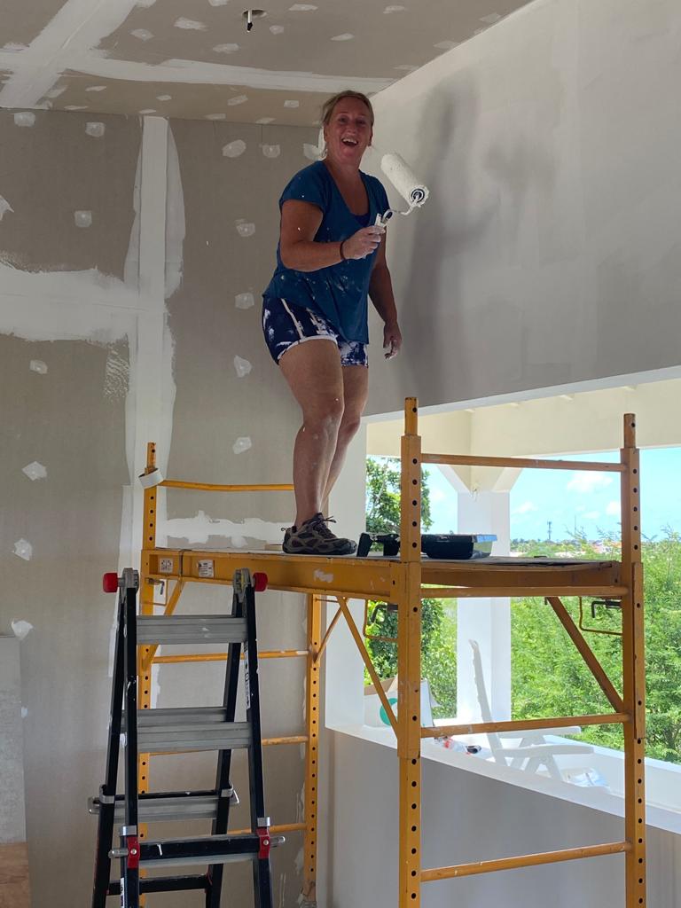 De meeste muren moeten nog afgewerkt worden door de stucadoors, of worden met cement grijs gemaakt, maar op sommige plekken kunnen we al witten. Mattie hier vol plezier mee bezig. Ik houd er niet van en doe meer de voorstrijk en bouwwerkzaamheden.
