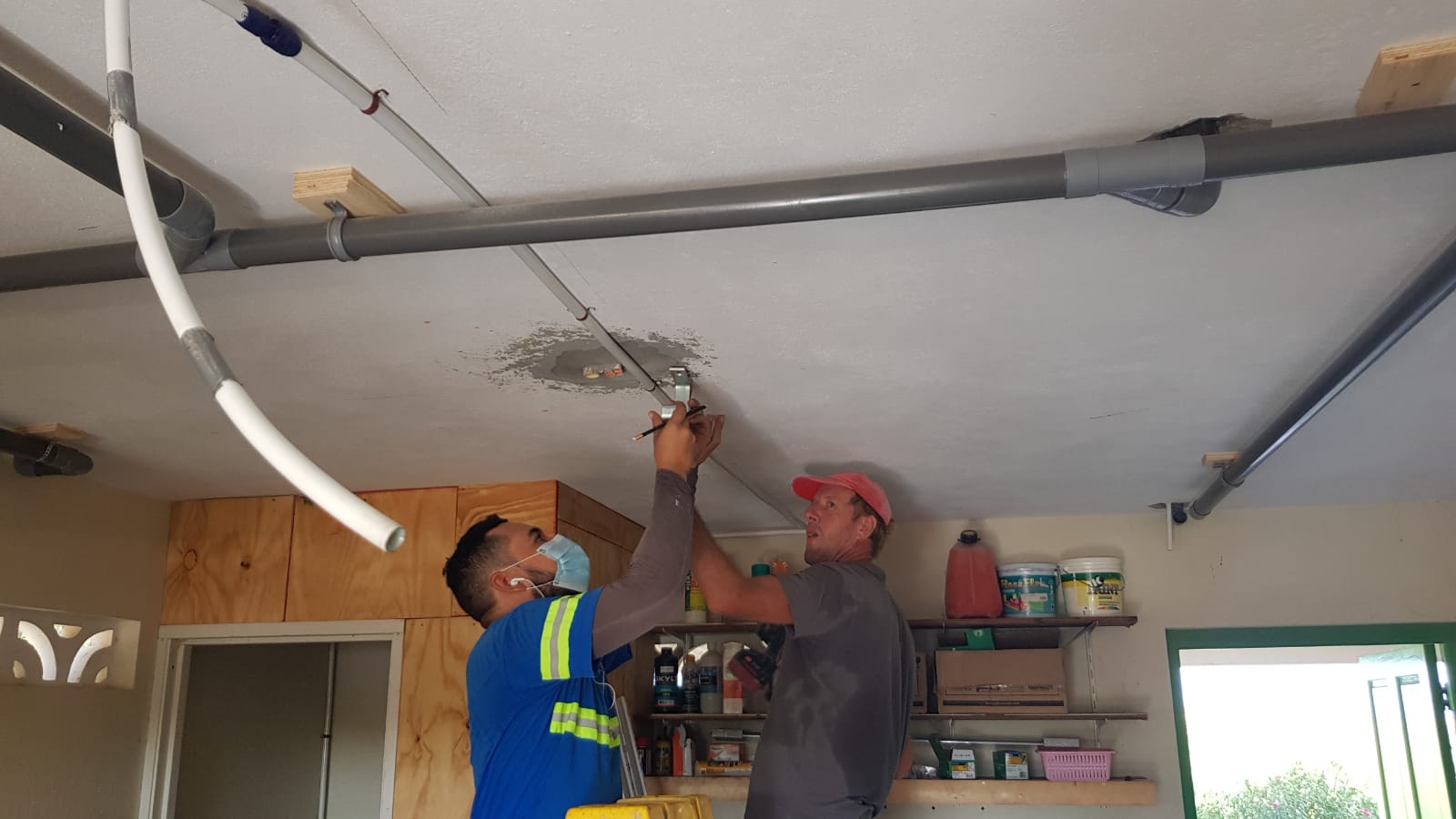 John, die de waterleidingen en de rioolpijpen aan het aanleggen is komt gelijktijdig aan met de elektricien op de kruising van water en elektra. Gelukkig spreken beiden Engels en spoedig en lossen ze het op. Even later werken ze parallel aan de leidingen naar beneden.