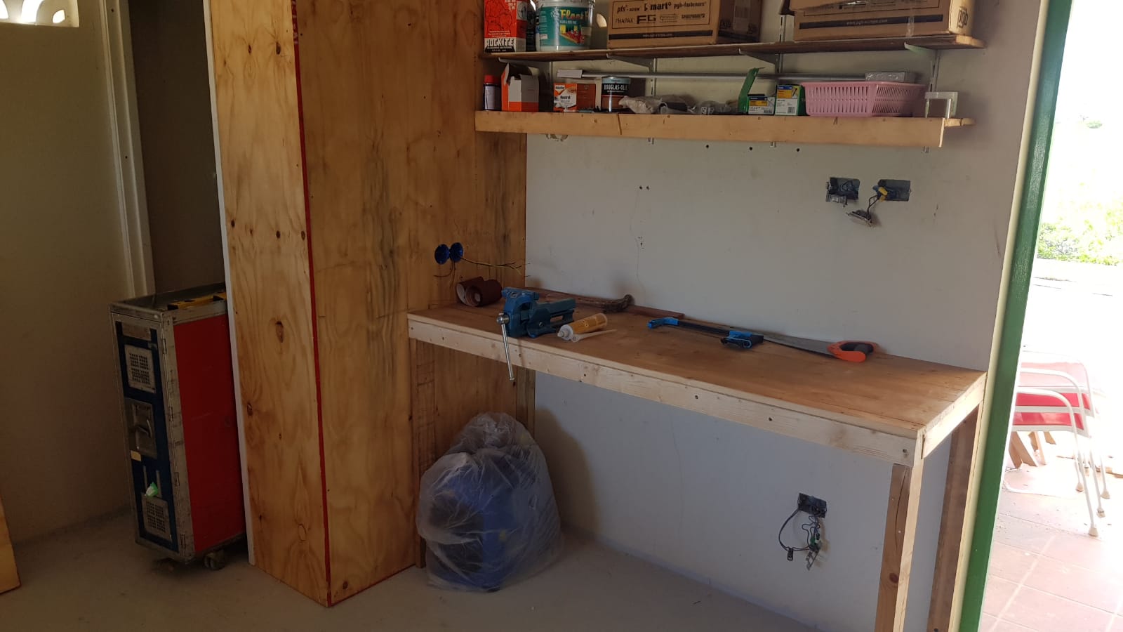 Tussen het verbouwen, schilderen en tuinieren door heb ik ook nog een werkbank en opberghok voor gereedschap (inclusief KLM trolley) getimmerd. De garage is er groot genoeg voor.