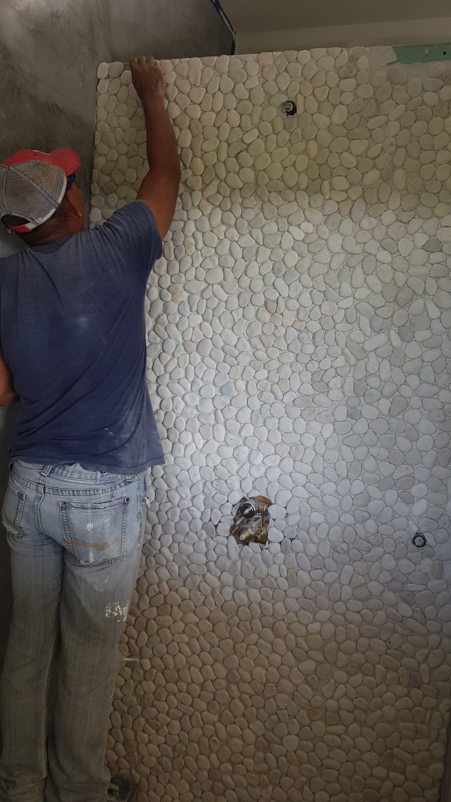Het tegelwerk is inmiddels ook begonnen. En wel meteen met de moeilijkste ‘tegel’. Allemaal steentjes. Weliswaar op een netje, maar toch veel maatwerk. Hier vallen de laatste stukjes op hun plek van de puzzel.