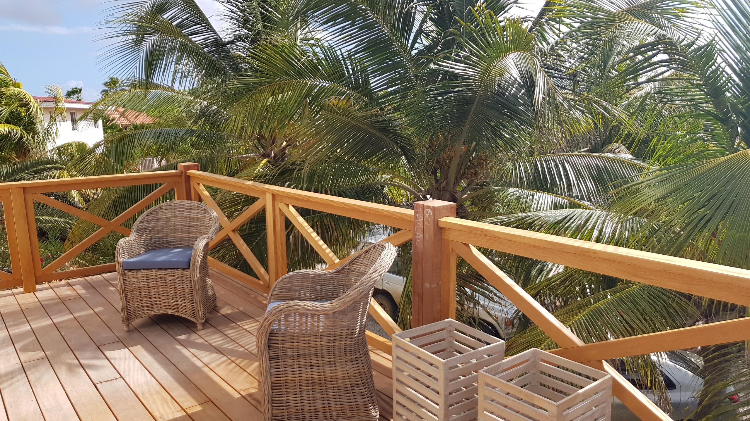 Om ons nieuwe balkon aan de voorkant staat nu een schitterende balustrade. Stukje vakmanschap. En nu zie je tevens het leuke van een oud huis kopen: de tuin staat vol volwassen bomen en op ons balkon zit je gewoon tussen de palmen. Met nu zelfs een vogelnestje met eitjes.
