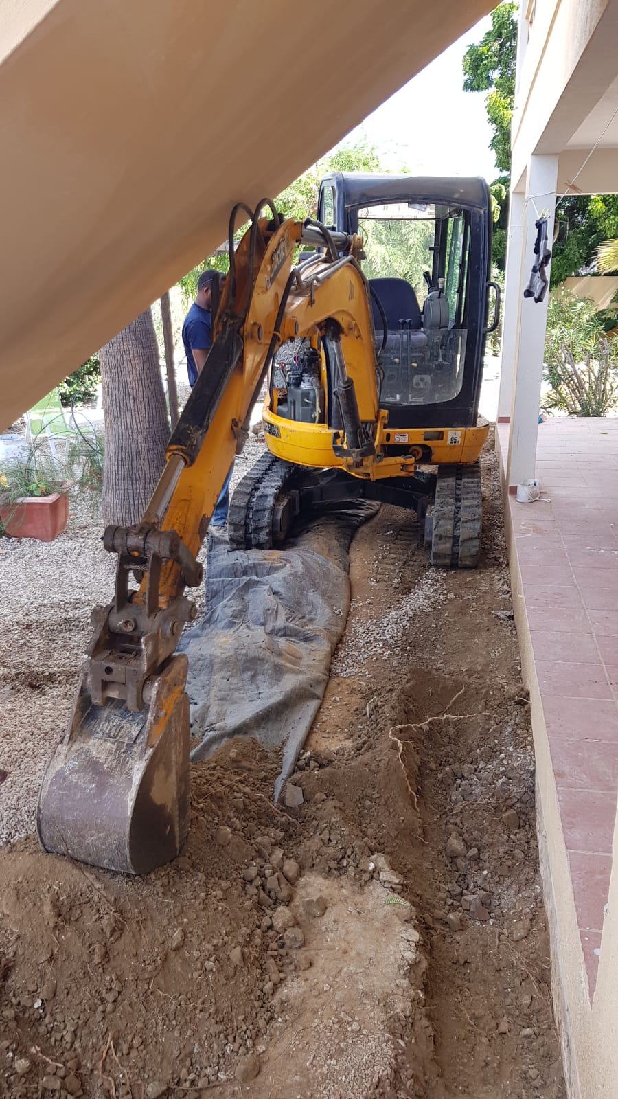 Alles hebben we vernieuwd, elektra, water en nu ook afvoer. Zo’n dikke rioolbuis vanaf het gastentoilet en -douche kan nu natuurlijk niet meer door het huis, dus dat moet buitenom aangesloten worden op de bestaande riolering. Uit ervaring (zie post: ‘verstoppertje’) weet ik dat hier door de grond geen doorkomen aan is door de vele wortels en rotsen. Met een graafmachine ging dat wel prima, alleen manouvreren om en onder de trap was nog wel een klusje. Maar de buis ligt erin