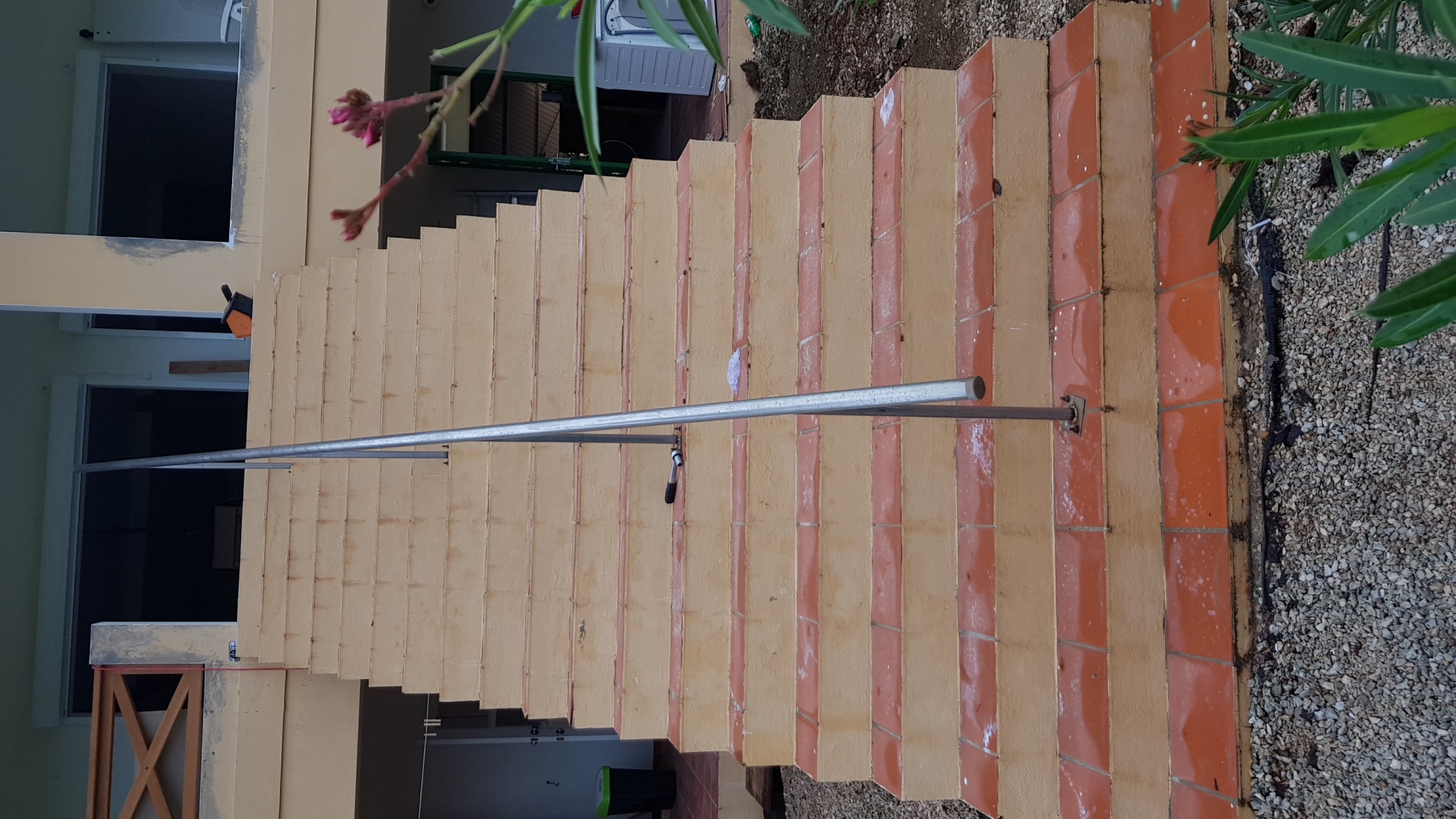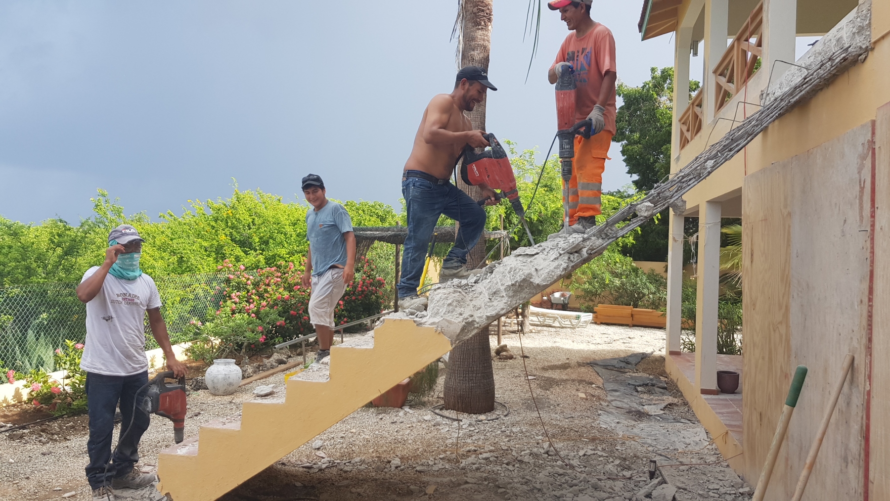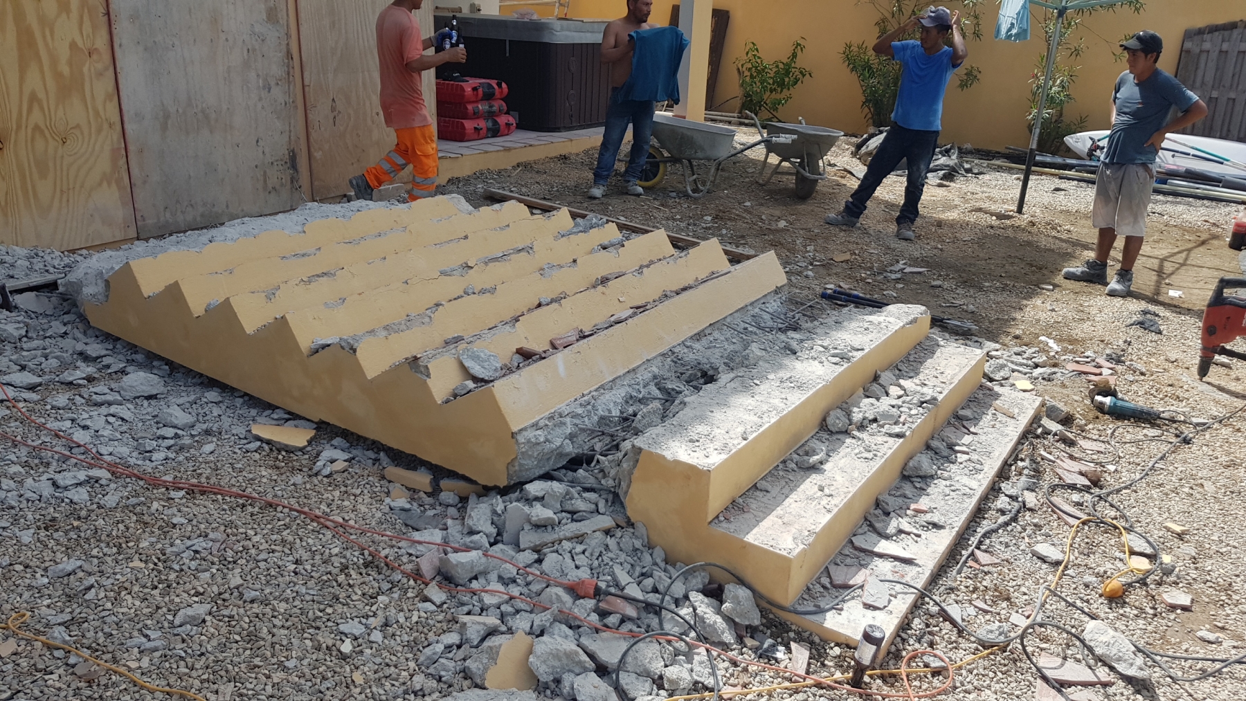 De trap aan de achterzijde vonden we eigenlijk nooit mooi en hij was ook best gevaarlijk. Dus besloten we om hem maar te gaan slopen. Dat was makkelijker gezegd dan gedaan. Vier man is anderhalve dag zwaar aan het hakken geweest voordat de trap zich gewonnen gaf. Eerst de bovenzijde alle beton eruit zodat hij alleen nog aan het betonijzer hing. Vervolgens van onder hakken met het doel dat hij zou breken. Het kreng was echter zo sterk dan hij nog steeds bleef hangen op een smal strook onderaan. Maar uiteindelijk kwam daar de grote klap, de trap was gevallen. Het restant is blijven liggen onder het volgende project, zie later.