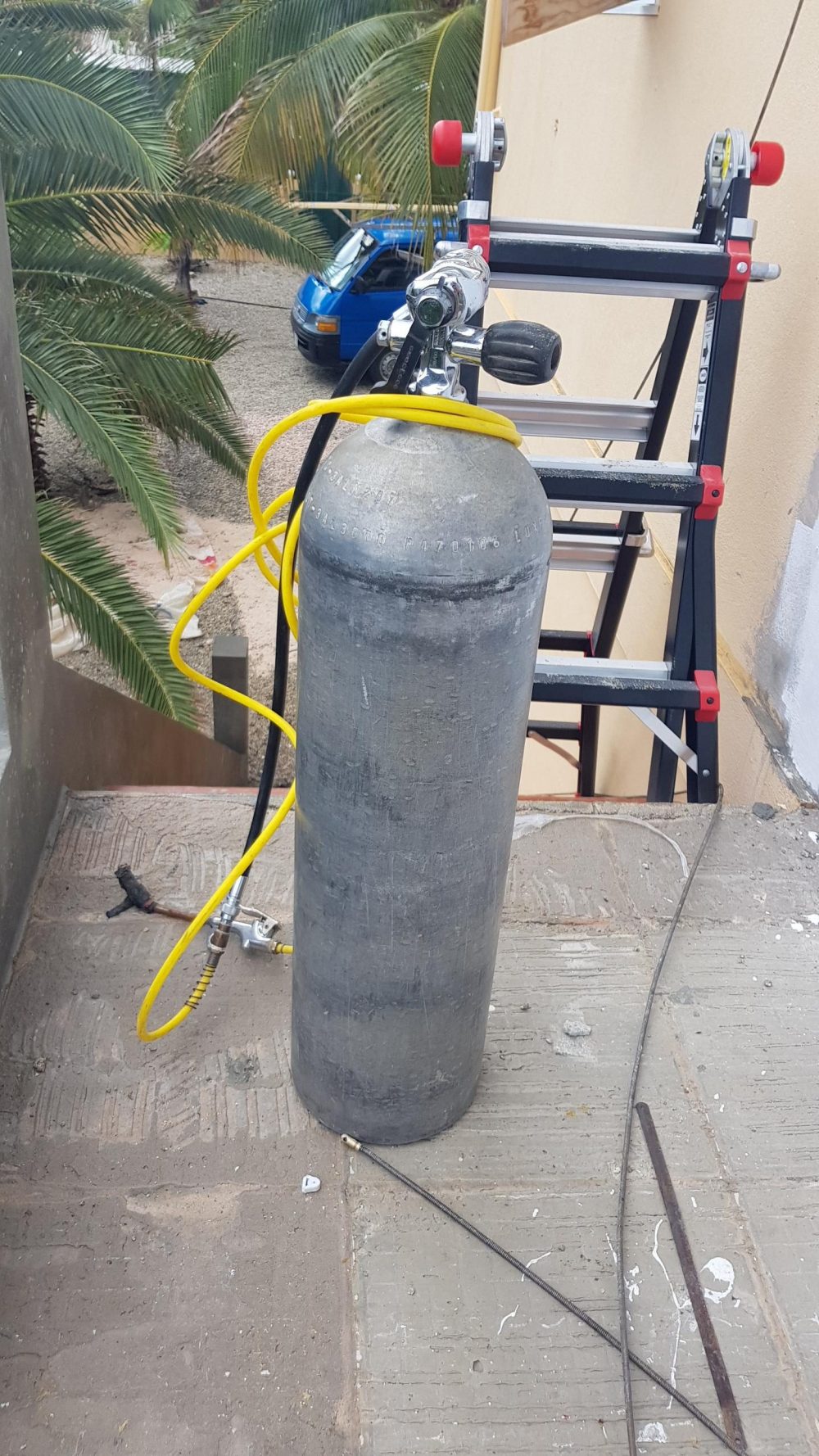 Zo’n huis zit stampvol met electriciteitsbuizen. Bij het trekken van draden moet je natuurlijk wel weten waar een en ander uit komt. Thuis doen we dat met een trekveer, maar hier blazen ze perslucht door de pijp en dat weet je aan de andere kant welke pijp het is. Dat is voordeel van verbouwen op een duikeiland!