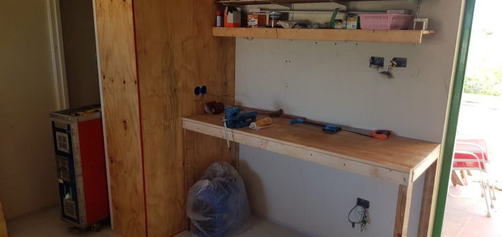 Tussen het verbouwen, schilderen en tuinieren door heb ik ook nog een werkbank en opberghok voor gereedschap (inclusief KLM trolley) getimmerd. De garage is er groot genoeg voor.