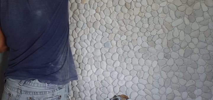 Het tegelwerk is inmiddels ook begonnen. En wel meteen met de moeilijkste ‘tegel’. Allemaal steentjes. Weliswaar op een netje, maar toch veel maatwerk. Hier vallen de laatste stukjes op hun plek van de puzzel.