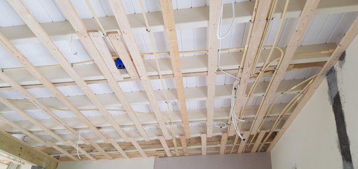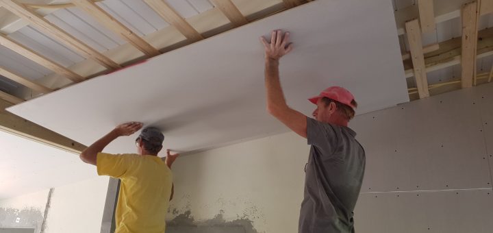 Het gaat best hard. Ook de plafondplaten zitten er nu in, met gaten voor alle spotjes en ventilatoren. De stucadoors gaan morgen het plafond mooi dichtsmeren.