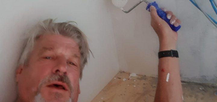 De meeste muren moeten nog afgewerkt worden door de stucadoors, of worden met cement grijs gemaakt, maar op sommige plekken kunnen we al witten. Mattie hier vol plezier mee bezig. Ik houd er niet...