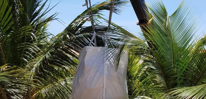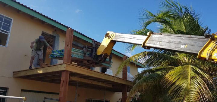 Waar gebouwd wordt ontstaat natuurlijk veel afval. Inmiddels hadden we twee ‘big bags’ vol. Een berichtje naar Jurgen en hij komt langs om de boel van het balkon te hijsen